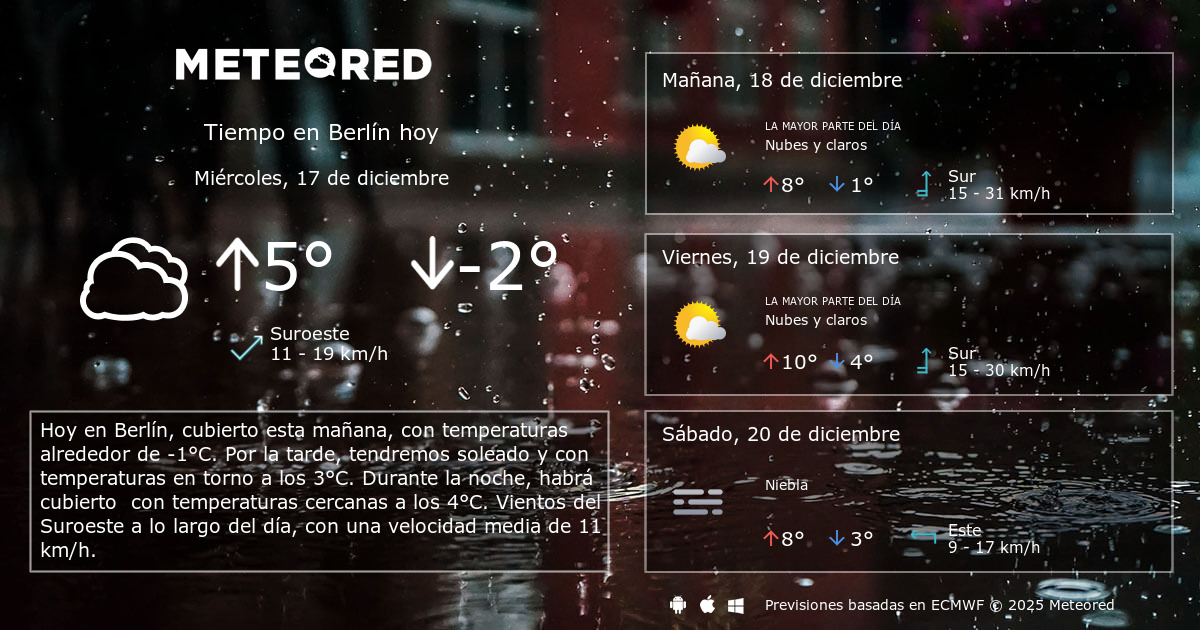 Sábado 107 nubes Máxima. Sábado 37 muy nuboso Máxima. Temperaturas probabilidad de lluvias y velocidad del viento. Si vas a viajar a Berlín en el futuro cercano puedes revisar el clima por mes en nuestro sitio por ejemplo.