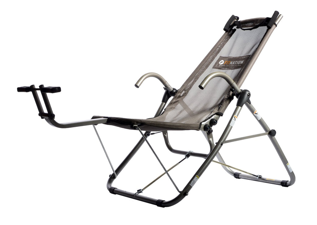 The FITNATION Core Lounge Ultra is a full-body-supported chair that folds to simulate crunches and extends over 180 degrees. 180 degrees are as far as you can extend on the floor doing traditional crunches but the Core Lounge Ultra can help you stretch past that all while cradling your head neck and back in comfy mesh.
